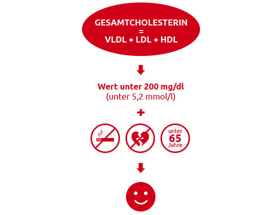 Liegt das Gesamtcholesterin unter 200 mg/dl (5,2 mmol/l), sind Sie Nichtraucher und gibt es in Ihrer Familie keine Hinweise auf das Vorhandensein von Herz-Kreislauf-Erkrankungen vor dem 65. Lebensjahr, liegt der Wert in einem günstigen Bereich. Überprüfen Sie dann Ihren Gesamtcholesterinwert etwa alle zwei Jahre, sofern Sie Ihre derzeitigen Lebens- und Ernährungsgewohnheiten beibehalten.
