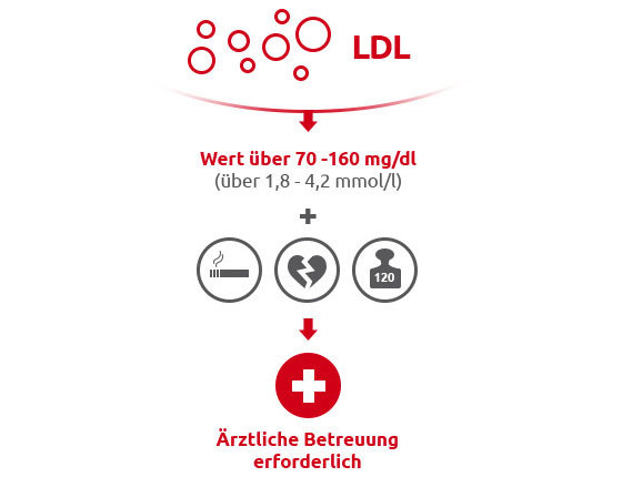 - Nach vorangegangenem Herzinfarkt oder ischämischem Schlaganfall, bei bestehendem Diabetes mellitus und/oder anderen Risikofaktoren in Bezug auf das Gefäßsystem sollte der Wert 100 mg/dl (2,6 mmol/l) bzw. bei sehr hohem Risiko sogar 70 mg/dl (1,8 mmol/l) nicht überschreiten.