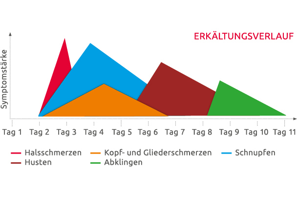 Halsschmerzen: Halsweh, das sich oft als „Halskratzen“ bemerkbar macht, tritt in der Anfangsphase (erste 1–2 Tage) auf und klingt oft nach 1–2 Tagen wieder ab. Manchmal können diese Symptome ausgeprägter sein. Es handelt sich hier um eine Rachenentzündung mit entzündlich veränderten Rachenschleimhäuten (Pharyngitis), die oft von Schluckbeschwerden begleitet wird. Bei einer ausgeprägten Pharyngitis können die Symptome noch ein paar Tage länger anhalten.